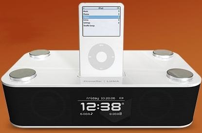 Luna iPod alarm dock. It's available for $149 and features a white-on-black clock that shows the time, date and dual-alarm settings: